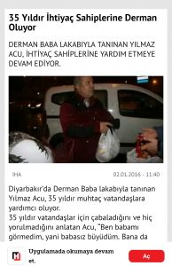 Bir diğeri de hayır sever bir vatandaşın 35 yıldır yoksullara ettiğini anlatan bir haberdi bu. Bölgede “Derman baba” lakabıyla anılan Yılmaz Acu adlı vatandaşın bunca yıldır, belediye ve valilik destekli yardımlar yapmaya çalışması konu edilmiş haberde..o haberin bir ekran görüntüsünü paylaşayım aşağıda..