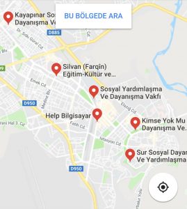 Tabi bunlarla da sınırlı değil, yardım faaliyetleri.. Aşağıda Diyarbakır’da hizmet veren yardım kuruluşlarını bulmak da hiç zor değil. Yine Google’a girin Diyarbakır’da yardım kurumları yazın ve maps’te aratın. Karşınıza hemen geliyor o bölgede ki kuruluşların yerleri. Söz konusu mamayı marketten çalmaya yeltenen baba için ”bu kadar yardım derneğinden faydalanmayı gururuna yediremediği için bu suçu işlemiştir” falan da demeyin sakın. Komik olur çünkü..